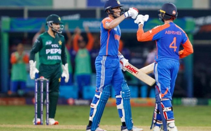 ਟੀਚੇ ਦਾ ਪਿੱਛਾ ਕਰਦਿਆਂ ਭਾਰਤੀ ਸਲਾਮੀ ਜੋੜੀ ਅਭਿਸ਼ੇਕ ਸ਼ਰਮਾ ਅਤੇ ਸ਼ੁਭਮਨ ਗਿੱਲ ਨੇ ਸ਼ੁਰੂ ਤੋਂ ਹੀ ਪਾਕਿਸਤਾਨੀ ਗੇਂਦਬਾਜ਼ਾਂ ਨੂੰ ਦਬਾਅ ਹੇਠ ਰੱਖਿਆ। ਪਾਵਰਪਲੇ ਦੇ ਸਿਰਫ਼ ਛੇ ਓਵਰਾਂ ਵਿੱਚ ਦੋਵੇਂ ਨੇ 70 ਤੋਂ ਵੱਧ ਦੌੜਾਂ ਜੋੜ ਕੇ ਮੈਚ ਭਾਰਤ ਦੇ ਪੱਖ ਵਿੱਚ ਮੋੜ ਦਿੱਤਾ। ਅਭਿਸ਼ੇਕ ਸ਼ਰਮਾ ਨੇ ਤੂਫ਼ਾਨੀ ਬੱਲੇਬਾਜ਼ੀ ਕਰਦਿਆਂ ਚੌਕਿਆਂ ਤੇ ਛੱਕਿਆਂ ਦੀ ਬਰਸਾਤ ਕੀਤੀ ਅਤੇ ਪਾਕਿਸਤਾਨੀ ਗੇਂਦਬਾਜ਼ਾਂ ਦੀ ਲਾਈਨ ਅਤੇ ਲੈਂਥ ਖਰਾਬ ਕਰ ਦਿੱਤੀ। ਦੋਵੇਂ ਖਿਡਾਰੀਆਂ ਨੇ ਸਿਰਫ਼ ਨੌਂ ਓਵਰਾਂ ਵਿੱਚ ਭਾਰਤ ਦਾ ਸਕੋਰ 100 ਦੇ ਪਾਰ ਪਹੁੰਚਾ ਕੇ ਜਿੱਤ ਦੀ ਨੀਂਹ ਮਜ਼ਬੂਤ ਕੀਤੀ।