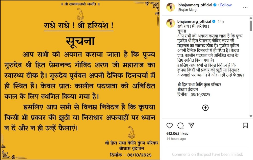 ਆਸ਼ਰਮ ਵੱਲੋਂ ਜਾਰੀ ਬਿਆਨ ਵਿੱਚ ਕਿਹਾ ਗਿਆ ਹੈ ਕਿ “ਸਤਿਕਾਰਯੋਗ ਗੁਰੂਦੇਵ ਸ਼੍ਰੀ ਹਿਤ ਪ੍ਰੇਮਾਨੰਦ ਗੋਵਿੰਦ ਸ਼ਰਨ ਜੀ ਮਹਾਰਾਜ ਪੂਰੀ ਤਰ੍ਹਾਂ ਠੀਕ ਹਨ ਅਤੇ ਆਪਣੀ ਰੋਜ਼ਾਨਾ ਦੀ ਆਧਿਆਤਮਿਕ ਕਾਰਜਸ਼ੀਲਤਾ ਜਾਰੀ ਰੱਖ ਰਹੇ ਹਨ। ਸਿਰਫ਼ ਸਵੇਰ ਦੀ ਯਾਤਰਾ (ਸਵੇਰ ਦੀ ਸੈਰ) ਨੂੰ ਕੁਝ ਸਮੇਂ ਲਈ ਮੁਲਤਵੀ ਕੀਤਾ ਗਿਆ ਹੈ।”