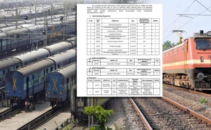 ਜਾਣਕਾਰੀ ਮੁਤਾਬਿਕ, ਜਲੰਧਰ ਕੈਂਟ, ਸਾਹਨੇਵਾਲ ਅਤੇ ਅੰਮ੍ਰਿਤਸਰ ਸੈਕਸ਼ਨ ਫਿਰੋਜ਼ਪੁਰ ਡਿਵੀਜ਼ਨ ਵਿੱਚ ਆਰਸੀਸੀ ਬੋਕਸ ਦੇ ਕੰਮ ਕਾਰਨ ਰੇਲ ਲਾਈਨ ਪ੍ਰਭਾਵਿਤ ਰਹੇਗੀ। ਇਸ ਕਾਰਨ ਕਈ ਪ੍ਰਮੁੱਖ ਟ੍ਰੇਨਾਂ ਦੇ ਸ਼ੈਡਿਊਲ ਵਿੱਚ ਬਦਲਾਅ ਕੀਤੇ ਗਏ ਹਨ।