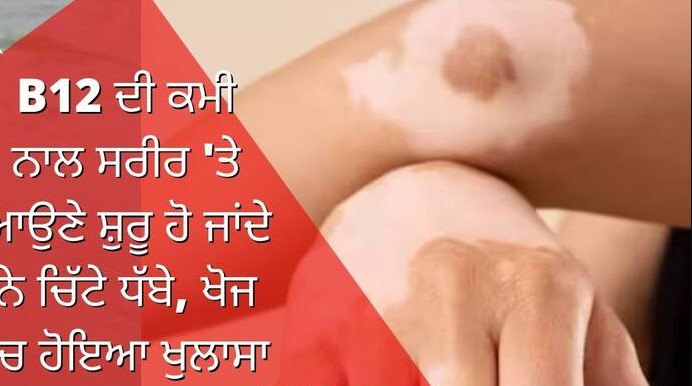 ਖੋਜਾਂ ਅਨੁਸਾਰ, ਵਿਟਾਮਿਨ B12 ਦੀ ਘਾਟ ਨਾਲ ਚਮੜੀ ‘ਤੇ ਚਿੱਟੇ ਧੱਬੇ (Vitiligo) ਪੈਣੇ ਸ਼ੁਰੂ ਹੋ ਸਕਦੇ ਹਨ। ਇਹ ਧੱਬੇ ਉਦੋਂ ਬਣਦੇ ਹਨ ਜਦੋਂ ਸਰੀਰ ਵਿੱਚ ਮੇਲਾਨਿਨ (Melanin) ਦੀ ਮਾਤਰਾ ਘਟ ਜਾਂਦੀ ਹੈ — ਜੋ ਚਮੜੀ ਦਾ ਕੁਦਰਤੀ ਰੰਗ ਬਣਾਈ ਰੱਖਦਾ ਹੈ। ਮੇਲਾਨਿਨ ਘਟਣ ਕਾਰਨ ਚਮੜੀ ਦਾ ਰੰਗ ਹੌਲਾ ਹੋ ਜਾਂਦਾ ਹੈ ਅਤੇ ਸਰੀਰ ਦੇ ਕੁਝ ਹਿੱਸਿਆਂ ‘ਤੇ ਸਫ਼ੇਦ ਧੱਬੇ ਪੈਣ ਲੱਗਦੇ ਹਨ।